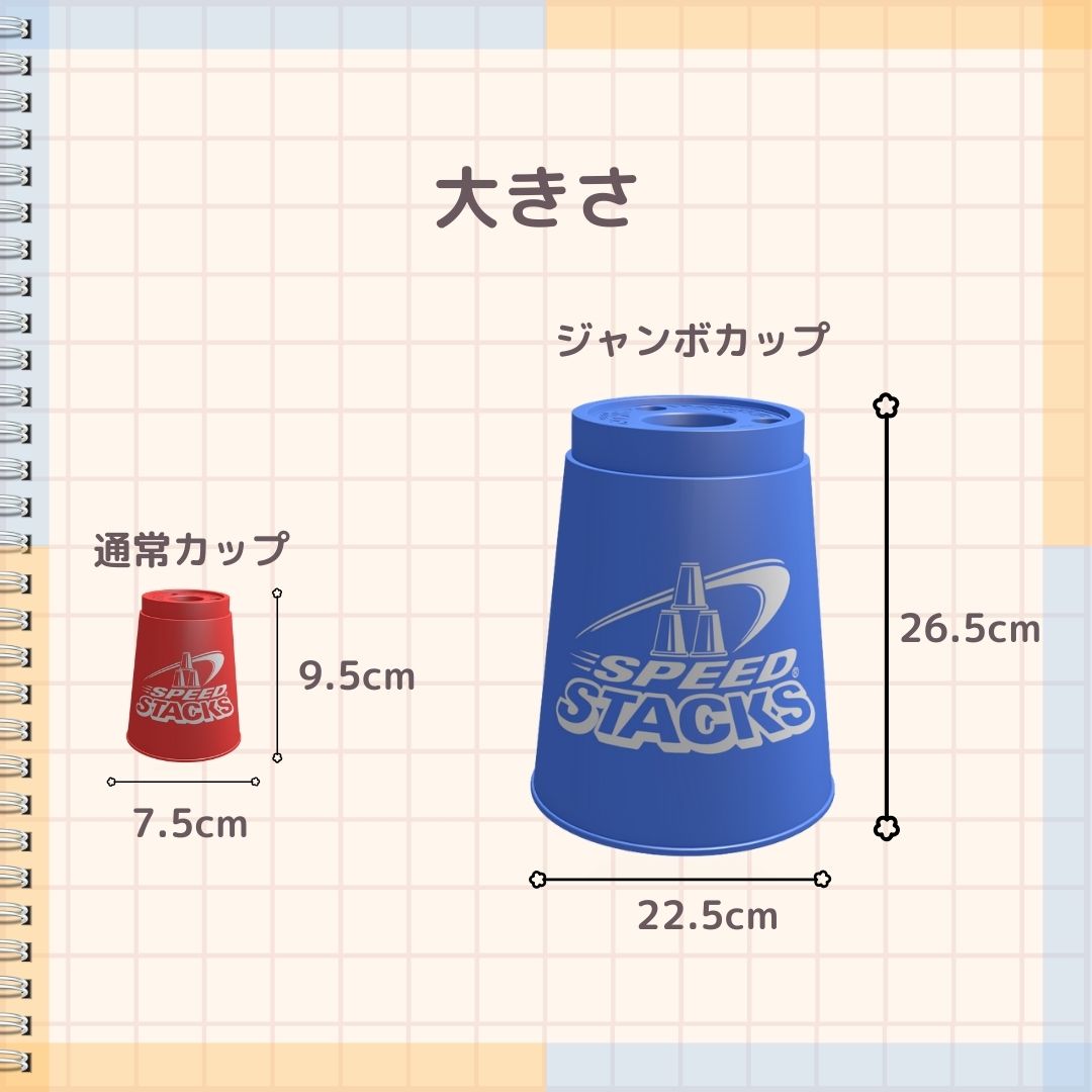 このジャンボカップは、通常のスタックカップよりも大きいサイズで、子供から大人まで幅広く楽しめます。反射神経や集中力を鍛えることができるため、ストレス解消や運動不足の解消にも役立ちます。
