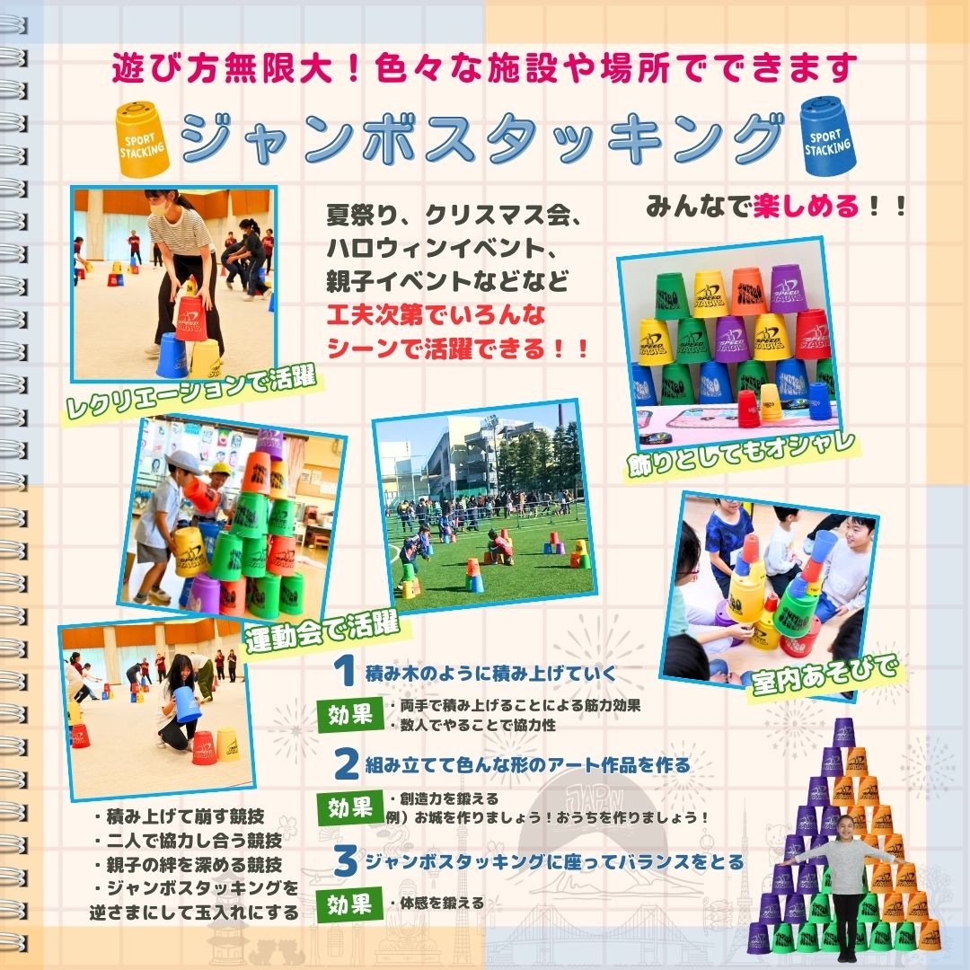 スポーツスタッキングジャパン公認の「ジャンボスタックス12個×3セット」は、園行事、施設などで楽しめるレクリエーションにぴったりのアイテムです。