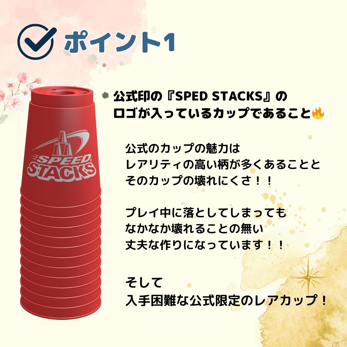 こちらの通常シリーズはスタックスカップの中で最もスタンダードなカップで、色柄のバリエーションが豊富にあります。また、プロシリーズに比べて安定感があり、初心者に適しています。